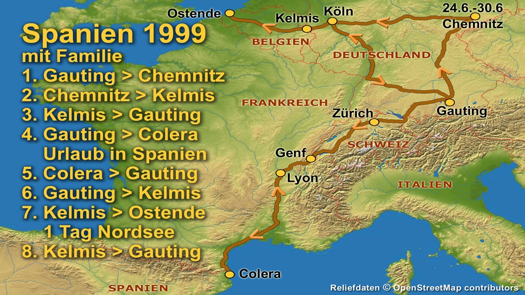 Von Kelmis aus fuhren wir nicht direkt nach Spanien. Donnerstag spät abends kamen wir in Gauting an. Der Freitag blieb uns für die Wäsche und zum Packen. Samstag früh ging es dann los mit vollem Auto für vier Personen und 14 Tage.