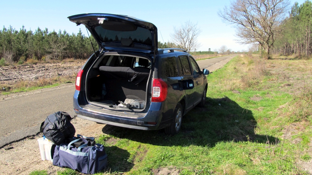 Irgendwo in Frankreich habe ich dann getankt, das erste Mal knapp 40 Liter. Dabei fasst mein Tank nur 45 Liter, ich hatte ihn also fast leer gefahren. Die 9 Liter im Reservekanister musste ich aber nicht anreißen. Das wäre wieder eine wahnsinnig große Umpackerei geworden, da der Kanister im Reserverad liegt und dieses ganz unten unterhalb des Kofferraums. Bisher ist es mir schon zweimal passiert, auf der Straße Packdienst zu üben.
