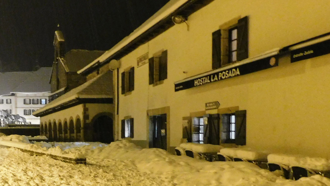 Schnee in den Pyrenäen. Spanischer Pilgerort Roncesvalles auf dem Gebirgskamm in 1100 Metern Höhe. Dieses Wetter hatte mich überrascht, allerdings nicht ungewöhnlich im November (16.11.).