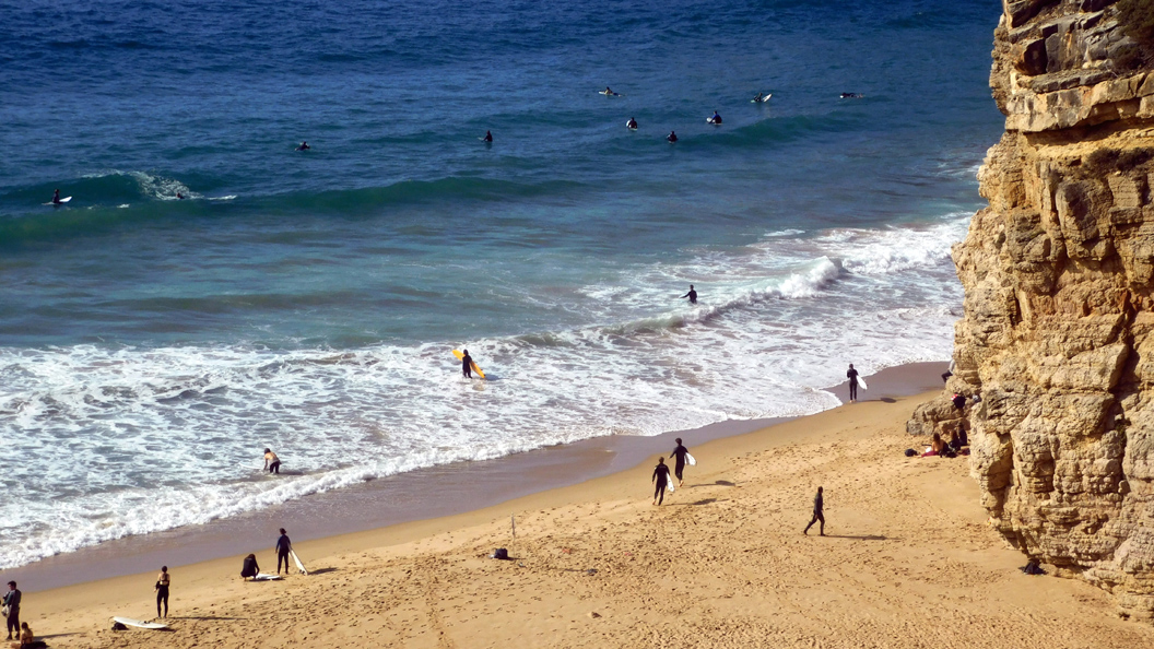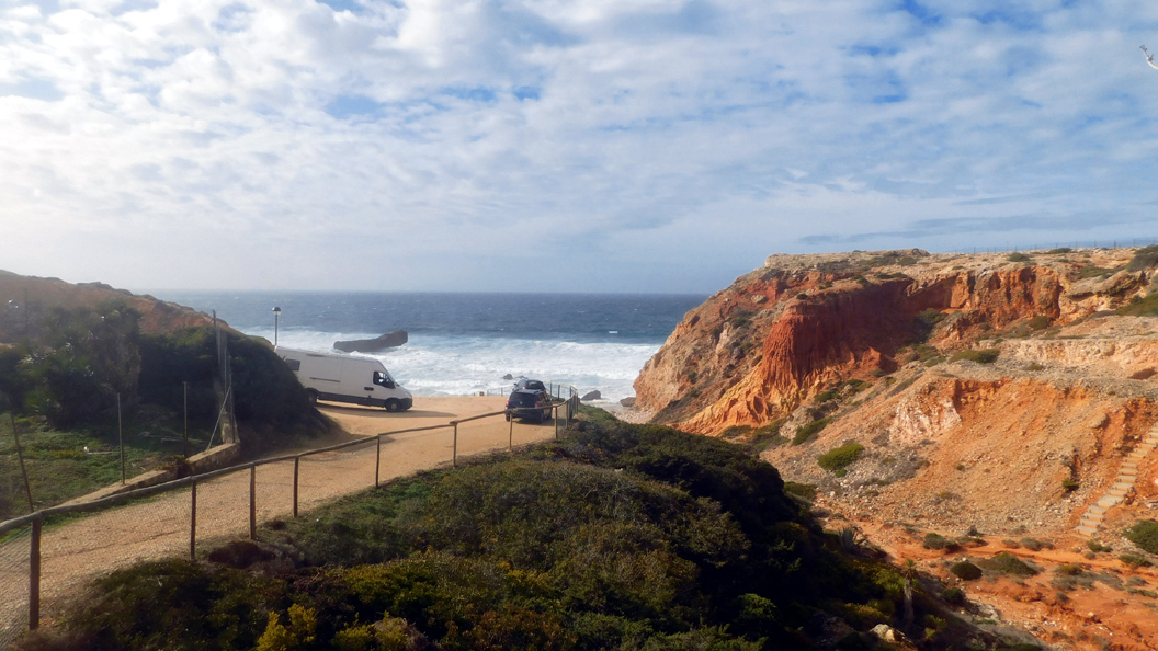 Am nächsten Strand, dem Praia do Zavial, standen nicht so viele Wohnmobile. Der Grund wird wohl gewesen sein, dass hier die Wellen nicht so hoch und regelmäßig waren. Die Parkplätze an der Straße waren so gut wie leer.