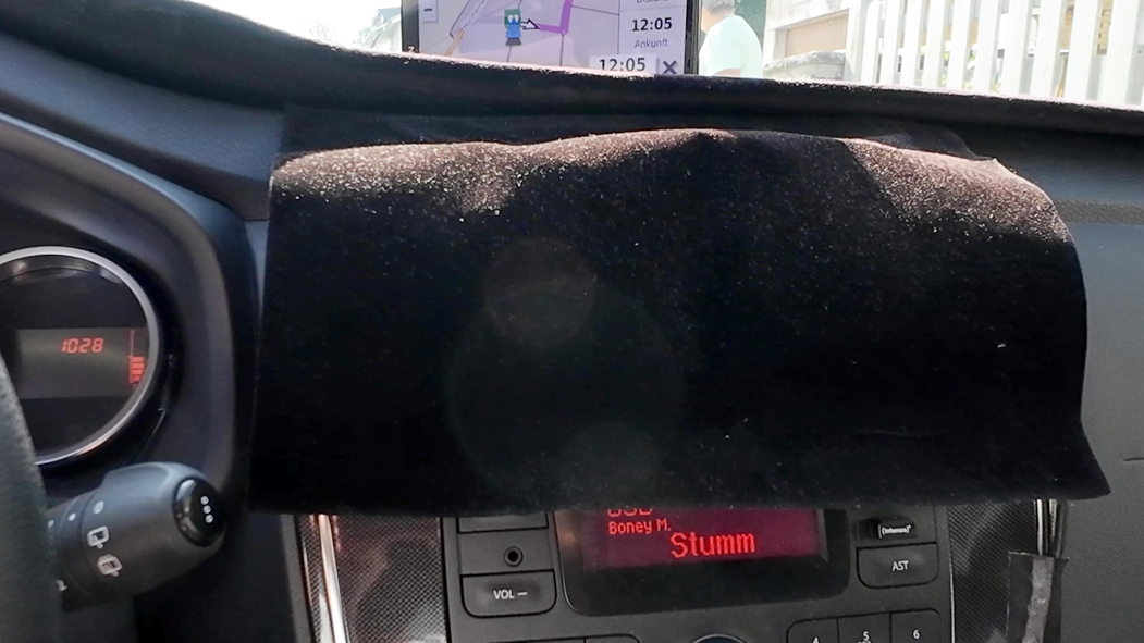 Die erste Sichtung der Videos hat Handlungsbedarf erzeugt. Das mittig angebrachte Navi auf meiner Ablage hinter der Windschutzscheibe spiegelte sich trotz Samtabdeckung in der Scheibe und erschien so schemenhaft auf den Videos der DJI Action-Kamera. Ich musste das Navi nach ganz links versetzen, wo das alte kleinere Navi angebracht war. Dadurch hat sich die Spiegelung erledigt, da der Aufnahmebereich der Kamera nicht bis dorthin reicht.
