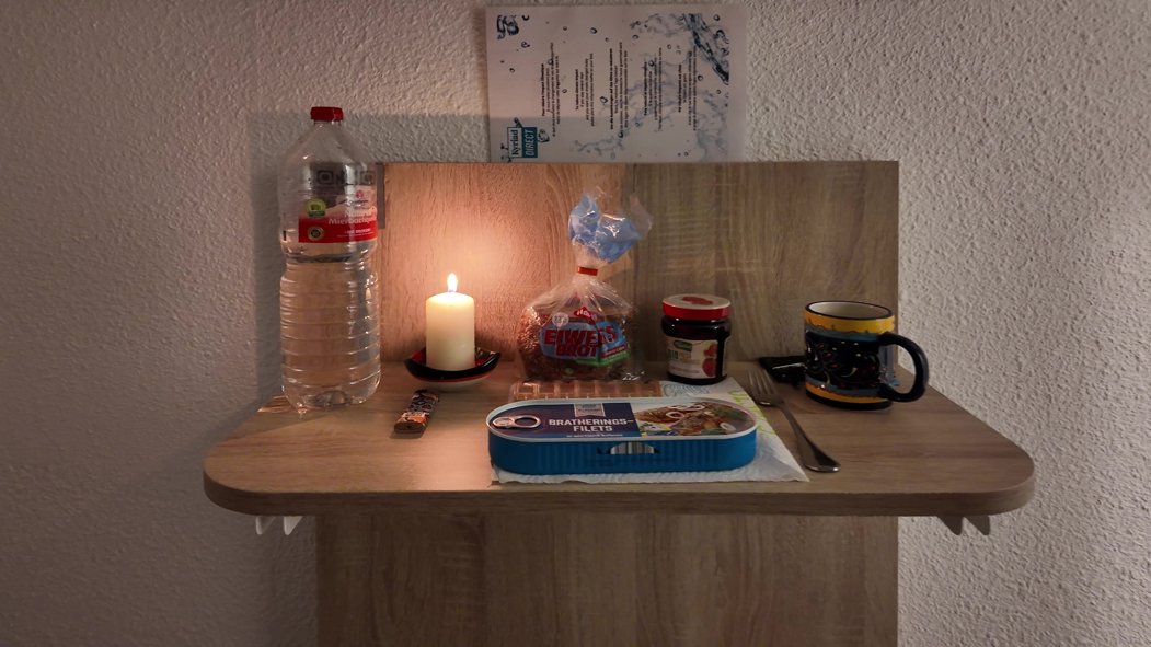So ein kleiner Tisch muss reichen. Darüber hängt der Fernseher. Das Mini-Bad braucht Platz. Die zusätzliche Schlafgelegenheit über den zwei Betten gibt es nicht mehr. Auch die Nachtschränkchen sind auf jeweils ein schmales Brett geschrumpft.