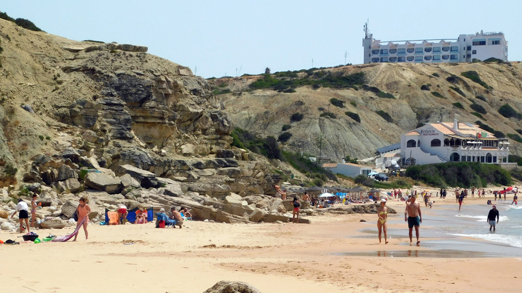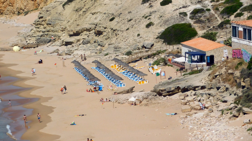 Die Liegen und Sonnenschirme gab es in den vergangenen Jahren noch nicht. So langsam kommerzialisiert sich der Strandbetrieb wie in den Urlauberhochburgen der östlichen Algarve.