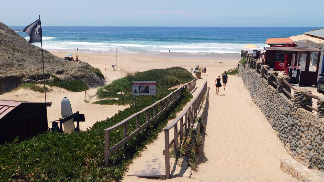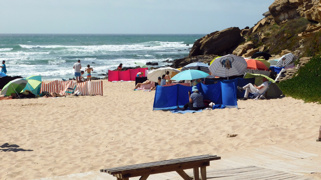 Praia de Santa Rita Norte, überhaupt nicht vergleichbar mit den Stränden ganz im Süden von Portugal. Hier nördlich von Lissabon ist der gewöhnliche Tourismus präsent. Das Bild zeigt nur einen kleinen Teil der Menschenmassen, für die an einigen Stellen extra Holzlaufstege auf den Sand gelegt wurden.