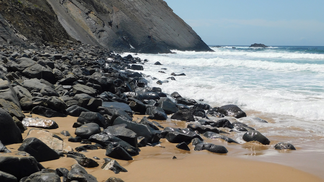 Bei Ankunft hinter ein paar größeren Felsen und zwischen den herumliegenden Steinen passierte es. Was? Das Ergebnis zuerst: Eine blau-grün-violett gefärbte große rechte Zehe, die auch noch zusehends anschwoll. Ich hatte mich mächtig gestoßen. Ich beeilte mich, mit den Füßen ins Wasser zu kommen. Das kühle Nass war zwar wohltuend, schon wegen der Schmerzlinderung, aber der bunte Anstrich blieb trotzdem. In der Hoffnung, dass die Schwellung bald zurückgeht, begann ich meine Strandwanderung im Wasser.