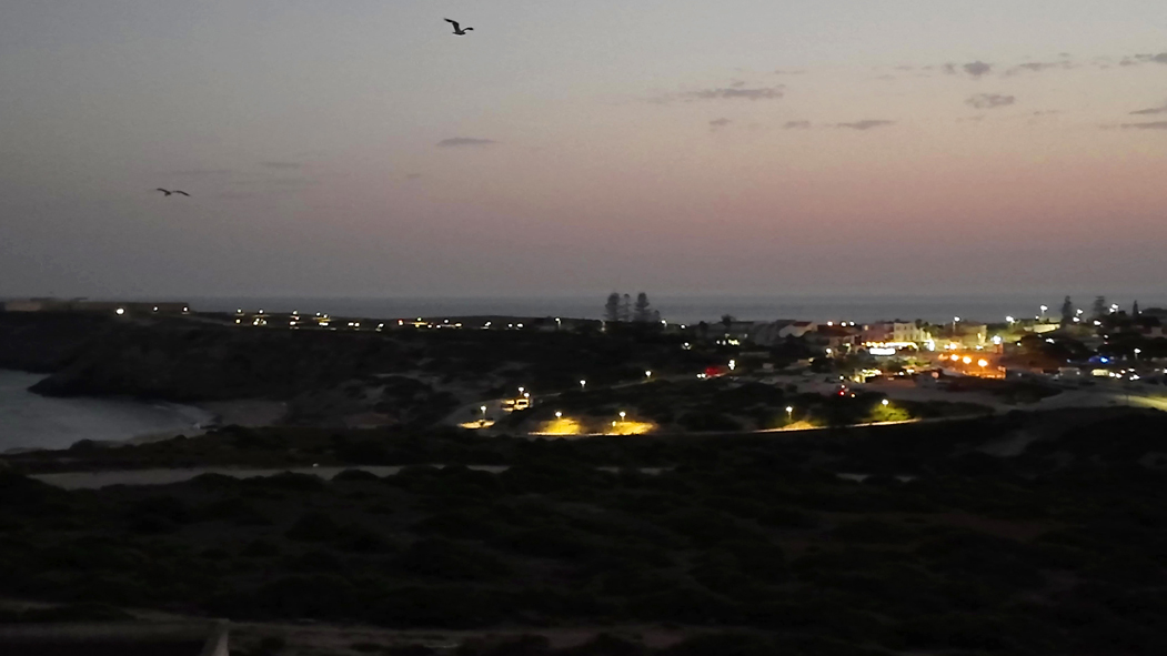 Diese Ansicht von Sagres bei Nacht mit den blinkenden Leuchttürmen ist mir in Suite 201 nicht vergönnt. Das ist mir gerade eben bei meinem Kontrollgang auf dem Balkon aufgefallen. Die Lichter der Stadt wirken statisch und monoton, wenn die Blitze der beiden Türme fehlen. Auch die beleuchteten Festungsmauern tragen zum mystischen Nachtbild von Sagres bei. Das alles ist auf der Ostseite des Hotels nicht zu sehen.
