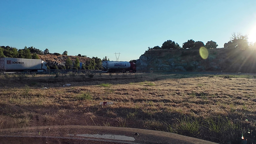 Parkplatz an der A-62, Hitze, WC schon länger geschlossen. Ich war nicht der Einzige, der hinter die Büsche musste.