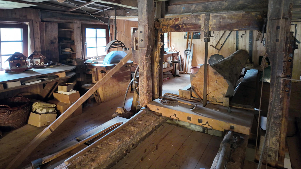Die Hochgangsäge für die Baumstämme wird von einem großen 4-Meter-Wasserrad angetrieben.