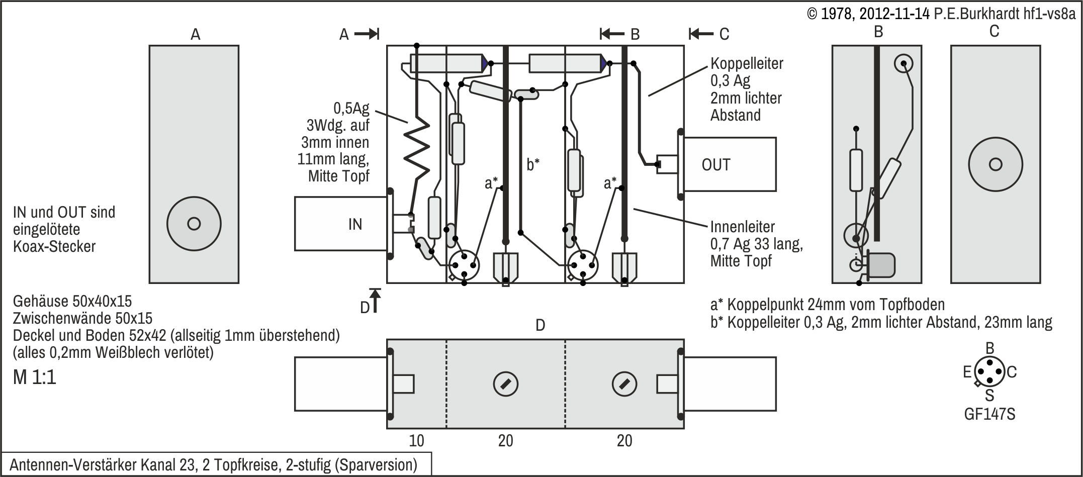 Wegen der hohen Verstärkung ist ein allseitig geschirmter Aufbau erforderlich. Wie damals üblich, wurde ein entsprechend aufgeteiltes Kammer-Gehäuse aus Cu-kaschiertem Material zusammengelötet (ähnlich UHF-Verstärker).