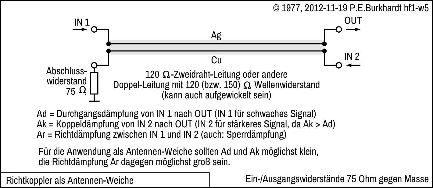 Im Bild sind die drei oft verwendeten Koppler dargestellt. Das stärkere Signal ist immer über den Koppeleingang (Eingang mit der Koppeldämpfung Ak) angeschlossen. Das Signal des Fernsenders hängt am durchgehenden Wellenleiter mit der Durchgangsdämpfung Ad, die etwas geringer ist. Je nach Pegel können die Eingänge natürlich auch anders belegt werden.