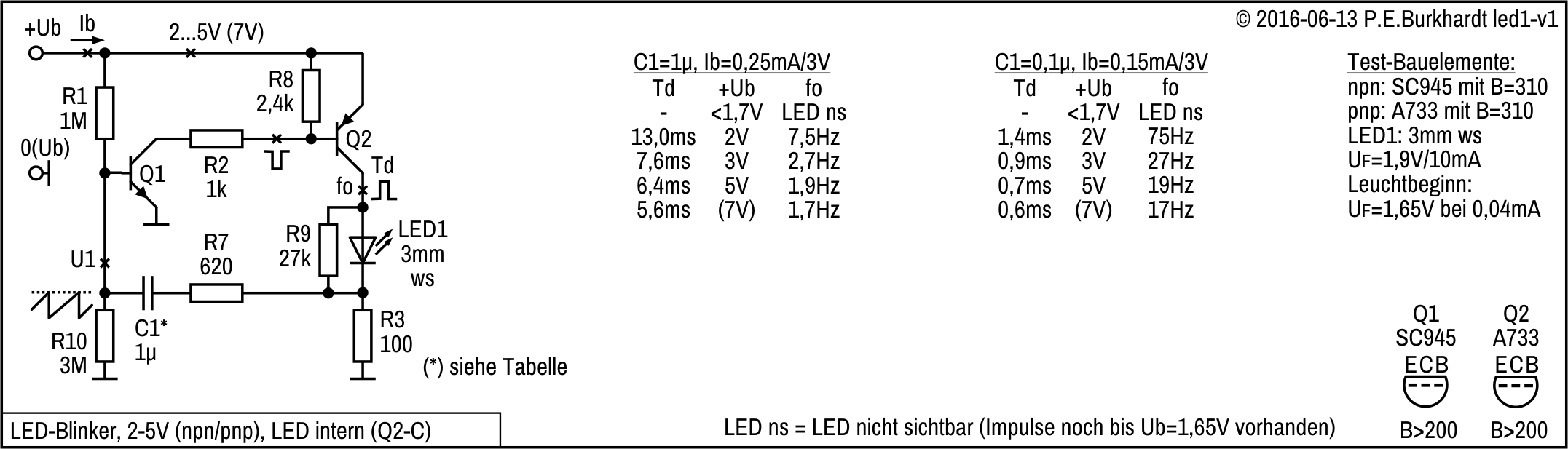 LED1 ist eine glasklare runde 3mm-Diode mit niedrigem Leuchtbeginn. Schon bei 40 Mikroampere LED-Strom zeigt sich ein deutlich erkennbarer Leuchtpunkt. Das ist günstig, weil dadurch ein unerwünschter LED-Strom während der LED-Dunkelphase gut erkennbar ist. Die LED sollte im Impulsbetrieb bis zu 200 mA aushalten können, was aber die meisten kleinen LEDs verkraften. Vorsicht ist aber angebracht, wenn beim Test einer Schaltung der AMV nicht schwingt und im leitenden Q2-Zustand verharrt. Die LED wird dann mit Dauerlicht leuchten und relativ schnell überlastet, wenn +Ub hoch genug ist.
