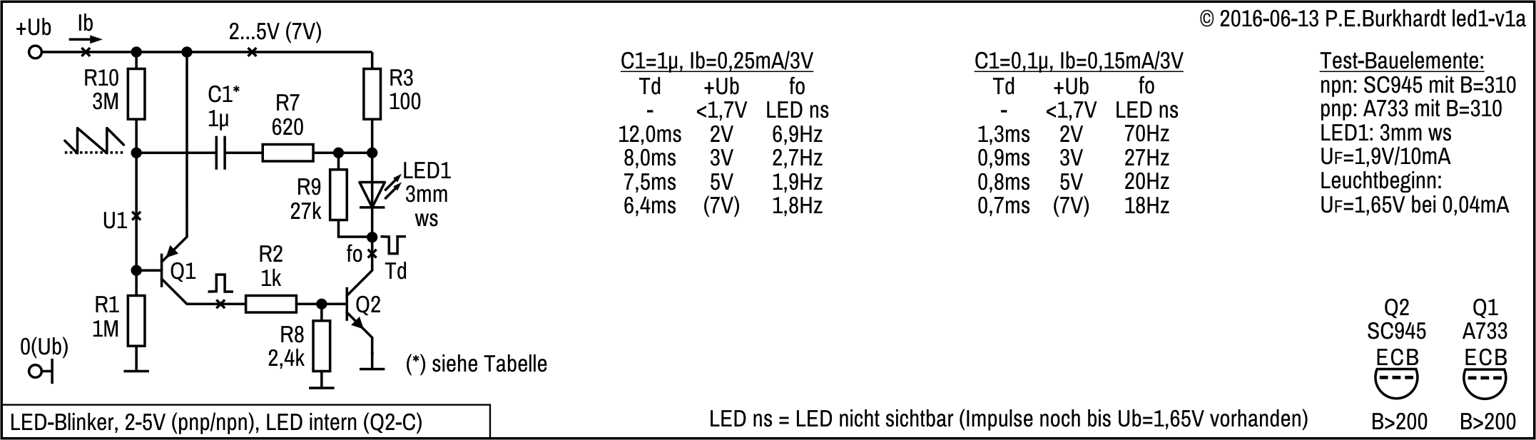 Nehmen wir an, C1 ist an der Q1-Basis-Seite auf seine maximal mögliche Spannung aufgeladen. Diese maximale positive Spannung ist immer größer als +Ub, im Extremfall doppelt so hoch. Q1 und Q2 sind gesperrt. Über R1 wird C1 langsam entladen, bis die Q1-Basis-Emitter-Spannung ca. +Ub - 0,6 V erreicht hat. Q1 wird leitend, damit aber auch Q2. Der negative Spannungssprung am Q2-Kollektor bewirkt, dass LED1 aufblitzt (falls in Reihe mit R3 geschaltet) oder dass an R3 ein negativer Impuls zur Ansteuerung eines Treibertransistors zur Verfügung steht.
