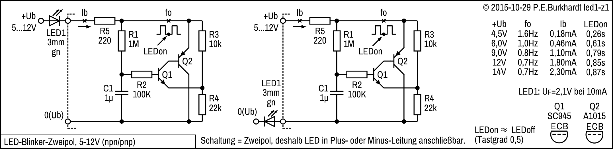 Wird die LED in der Stromversorgungsleitung des AMVs angeordnet, erhält man einen Zweipol, bei dem es keine Rolle spielt ob die LED in der Plus-Leitung oder in der Minus-Leitung liegt. Die folgenden Schaltungen unterscheiden sich von den bisherigen Anwendungsbeispielen in der Weise, dass die LED-Leuchtzeit genauso lang ist wie die LED-Pausenzeit. Das heißt, die erzeugte Schwingung hat einen Tastgrad von 0,5. Die längere LED-Leuchtzeit bewirkt eine höhere LED-Belastung. Der LED-Strom sollte nicht höher sein, als der zugelassene Strom für Dauerlicht.