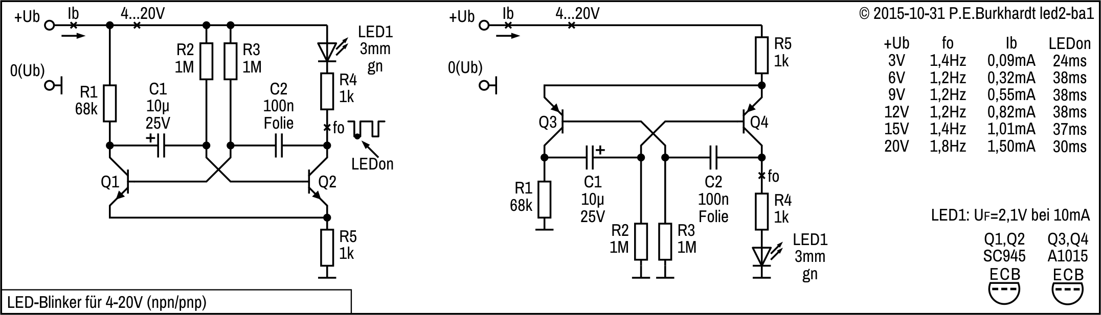 Die folgenden Blinker-Varianten sind alle im jeweils angegebenen Ub-Bereich getestet. Die Blinkfrequenz fo wurde mit einem digitalen Zähler, die Impulsdauer Td mit einem analogen Oszi bestimmt. Die Strom-Messung erfolgte mit einer speziellen Mess-Schaltung, um bei der sehr kleinen Einschaltdauer der Stromaufnahme die Strom-Mittelwerte bei akzeptabler Ablesezeit feststellen zu können.