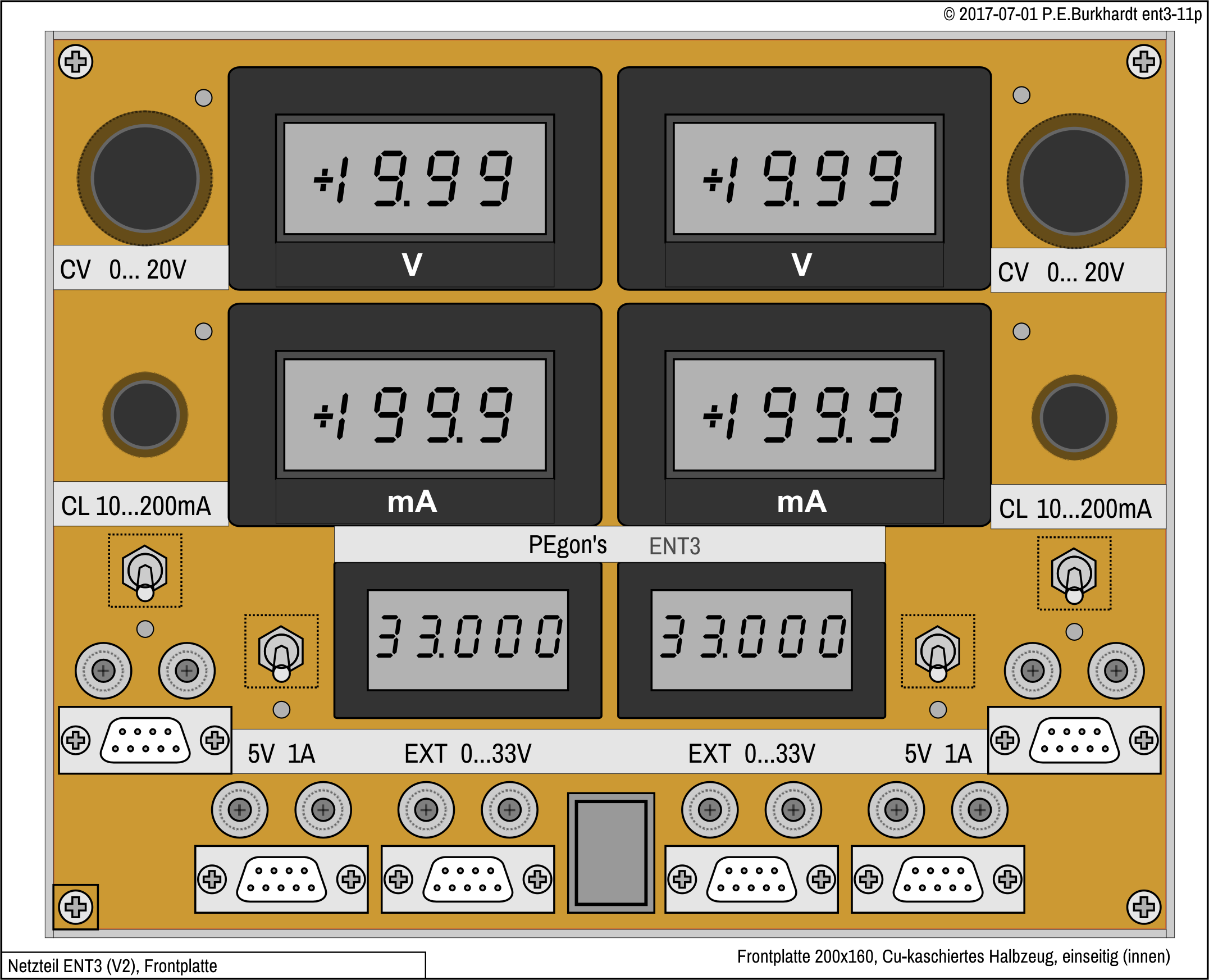 Das in 2007 schon einmal umgebaute Labor-Netzteil ENT1 hatte nach jahrelanger Nutzung wieder eine Renovierung verdient. Mit neuen Ringkerntrafos und zwei neuen digitalen Panels zur Anzeige der Ausgangsspannung hat das entstandene ENT2 folgende Eigenschaften:
