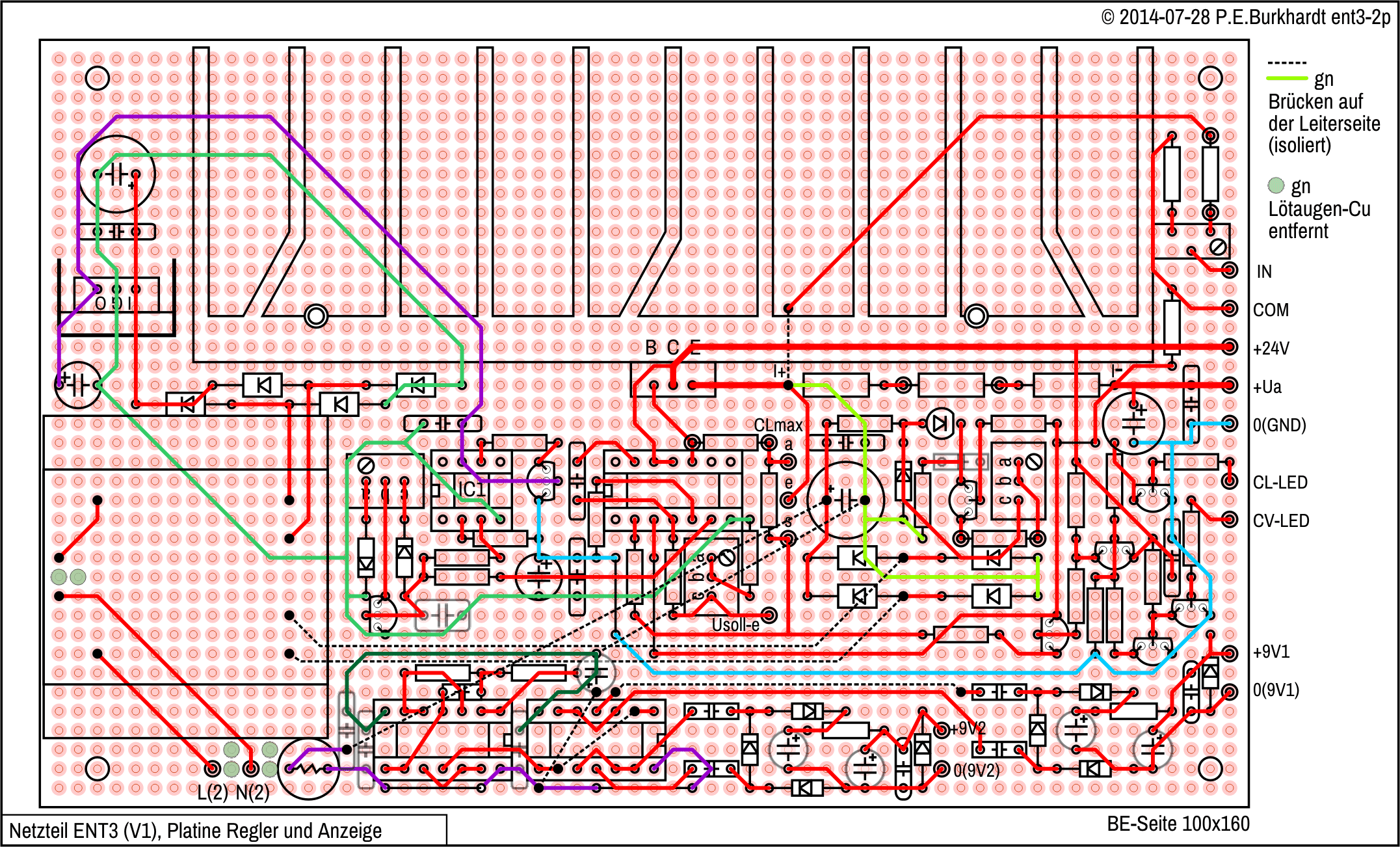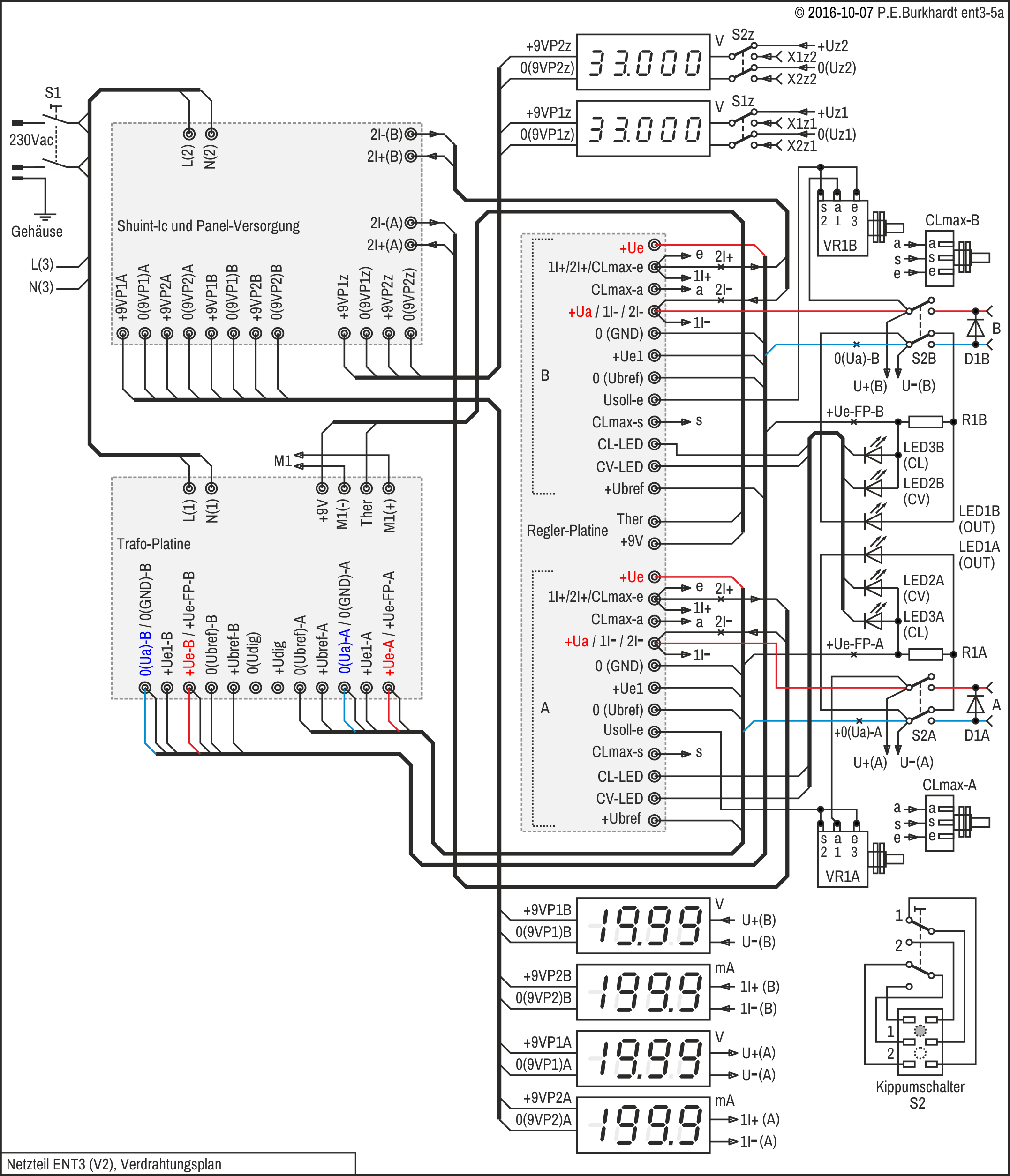 Die Schaltung enthält einige wichtige Messwerte. Die beiden Regelschaltungen einschließlich des Trafos mit Gleichrichter sind original ENT1v1. Nur die Sollspannungs-Einstellung wurde verändert (Fein-Regler).