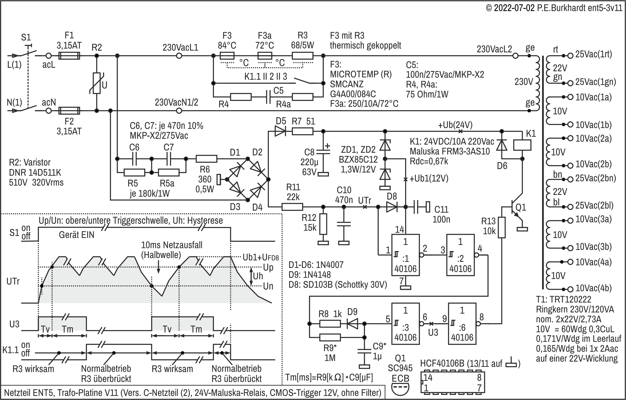 Das C-Netzteil entspricht dem C-Netzteil der Versionen 9 und 10. Für den strombestimmenden Kondensator sind zwei X2-Kondensatoren in Reihe geschaltet, so dass sich eine hohe Sicherheit gegen Durchschlag ergibt. Außerdem stellen hier zwei in Reihe geschaltete 12V-Z-Dioden die 24V-Versorgungsspannung des Relais bereit. Damit ist eine etwas geringere thermische Belastung je Z-Diode gegeben im Vergleich zu einer 24V-Z-Diode. Zwischen den beiden 12V-Z-Dioden stehen automatisch 12 V gegen GND zur Verfügung. Damit ist auch die Betriebsspannung Ub1 für den CMOS-Trigger gegeben.