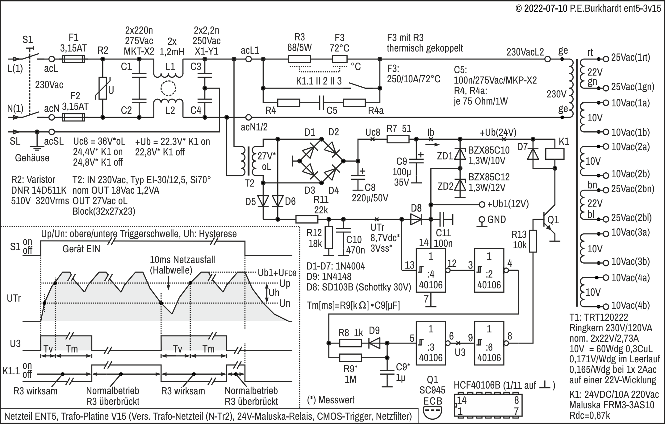 Die mit dem Trafo erzielte Gleichspannung reicht bequem für das 24V-Maluska-Relais. Die Begrenzung erfolgt mit 2 Z-Dioden 10 V und 12 V, wobei gleichzeitig die Versorgungsspannung +Ub1 für den mit 12 V betriebenen CMOS-Trigger entsteht.
