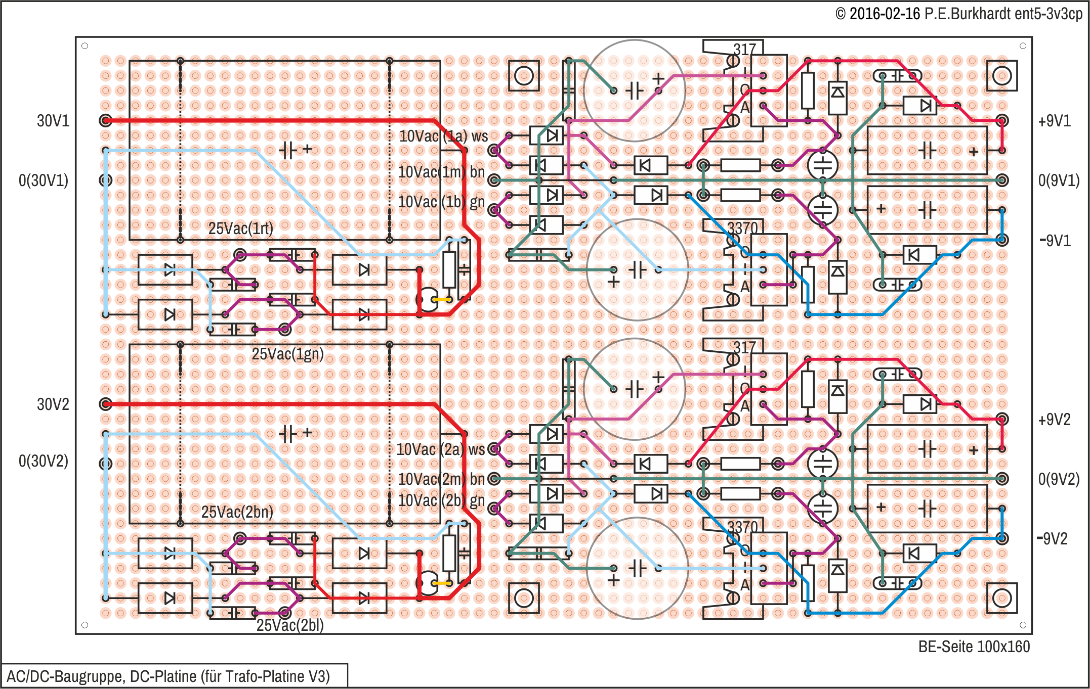 Die DC-Platine trägt die zwei Haupt-Brückengleichrichter mit Lade-Elko sowie 4 massesymmetrische Regelschaltungen mit je einem 9V-Ausgang.
