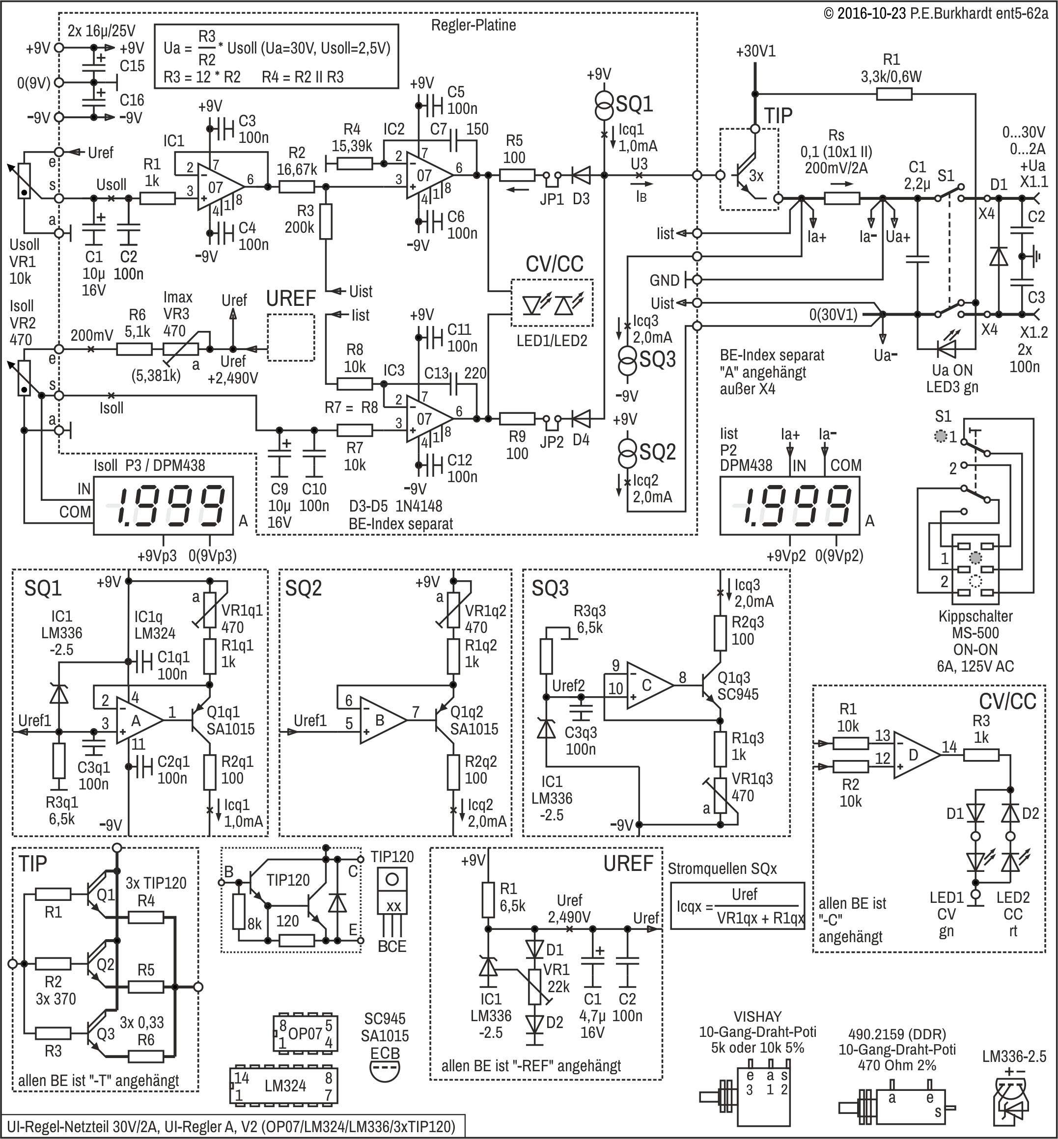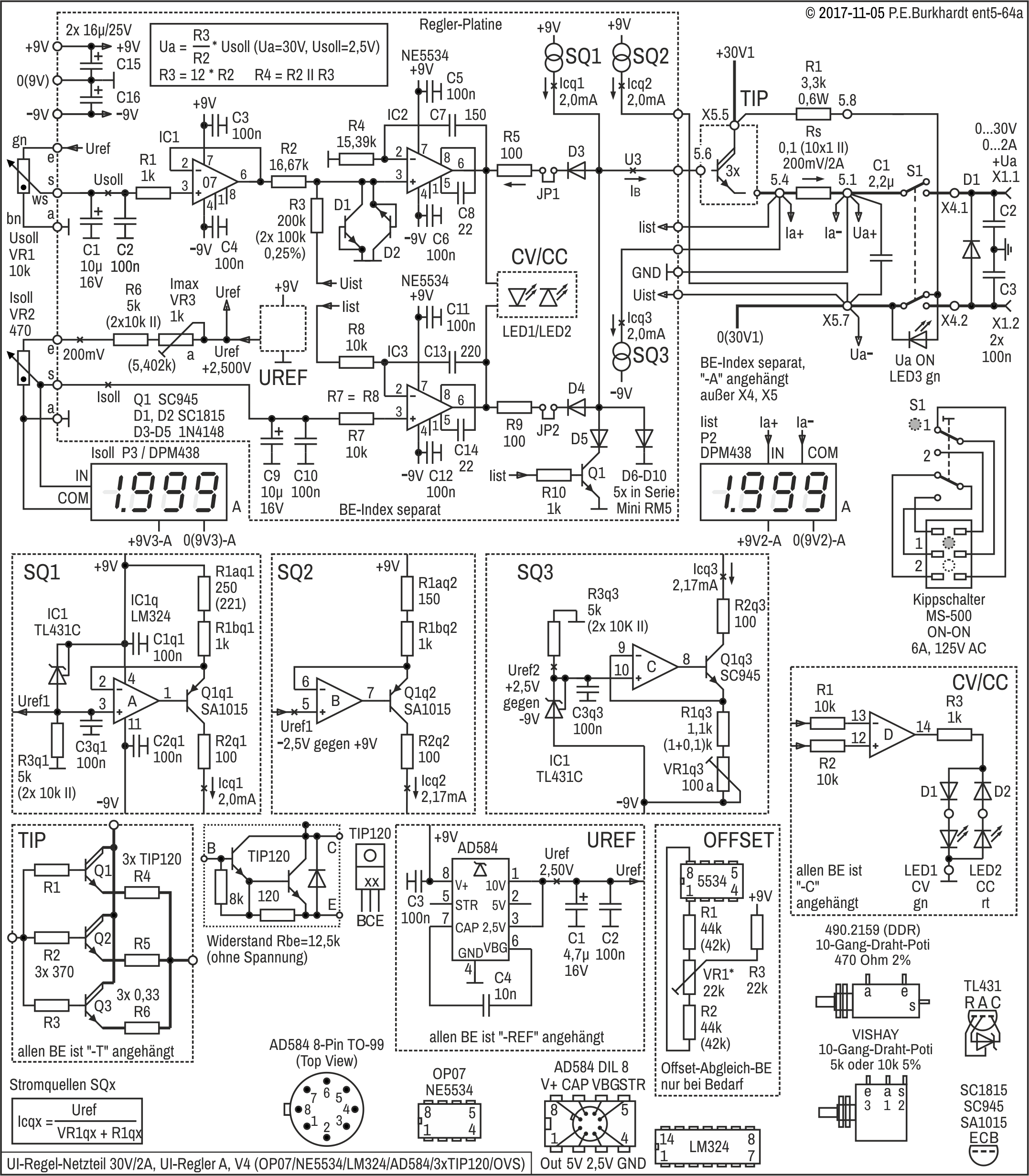 Damit trotz der umfangreichen Schaltung der funktionelle Überblick nicht verloren geht, wurden einige Funktionsgruppen nur symbolhaft gezeichnet. Das betrifft die Stromquellen (SQ1, SQ2, SQ3), die Referenzspannungserzeugung (UREF), der Transistor-Längsregler (TIP) und die Anzeige der Betriebsart (CV/CC). Die detaillierte Schaltung dieser Funktionsgruppen ist im unteren Teil des Gesamt-Stromlaufplans dargestellt.