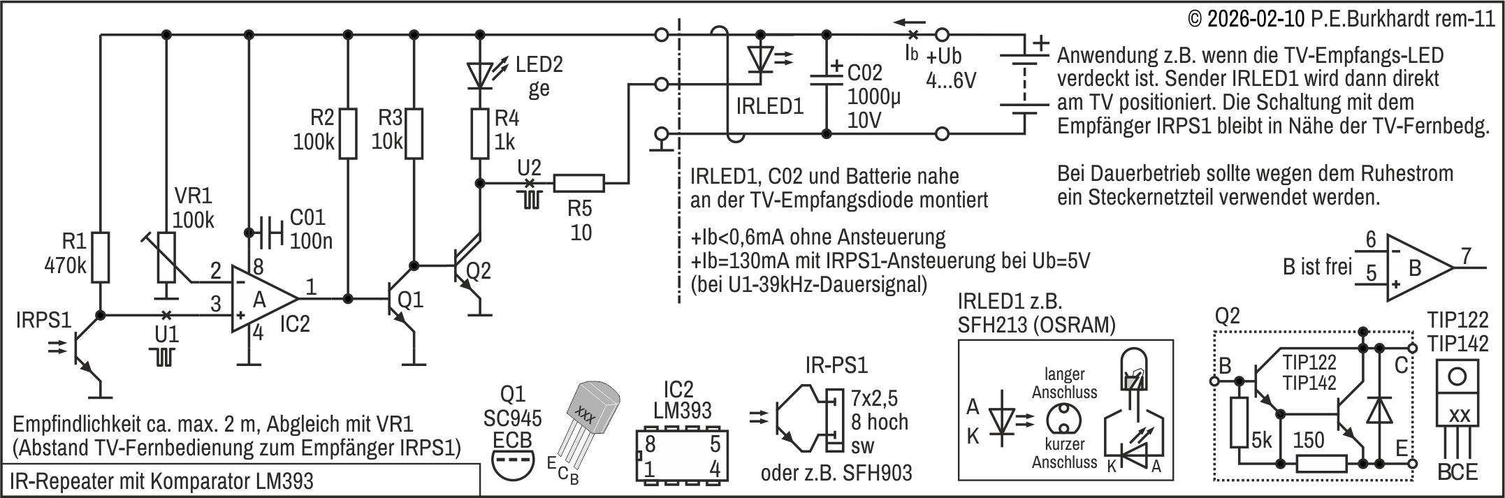 IR-Repeater zur Verlängerung der Reichweite von z.B. TV-Fernbedienungen sind am einfachsten durch direkte Verstärkung der Sendeimpulse realisierbar. Der verstärkte Datenstrom kann dann mit einer IR-LED unmittelbar vor dem TV-Empfangsmodul abgestrahlt werden. Die Verbindung zwischen Verstärker-Schaltung und Sendediode erfolgt über eine 2-Draht-Leitung. Die originale TV-Fernbedienung und das TV-Gerät müssen sich also nicht mehr "sehen".