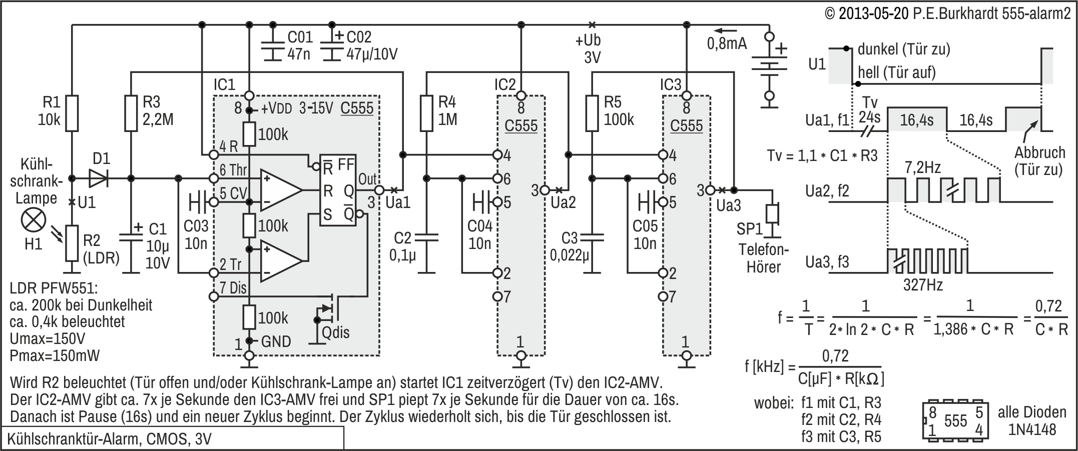 Sobald der Fotowiderstand Licht erhält (Tür offen und/oder Kühlschrank-Lampe an) wird er niederohmig. Dadurch trennt Diode D1 die Geberschaltung vom Intervall-AMV IC1. Nach eienr Verzögerungszeit kann der AMV IC1 normal arbeiten und liefert die Intervall-Impulsfolge. Ua1 = H gibt den AMV IC2 frei. Dieser liefert die NF-Signal-Folge. Bei jedem Ua2 = H kann schließlich der AMV-Tongenerator IC3 arbeiten. Die erzeugte NF wird direkt vom 555-Ausgang an SP1 ausgegeben.